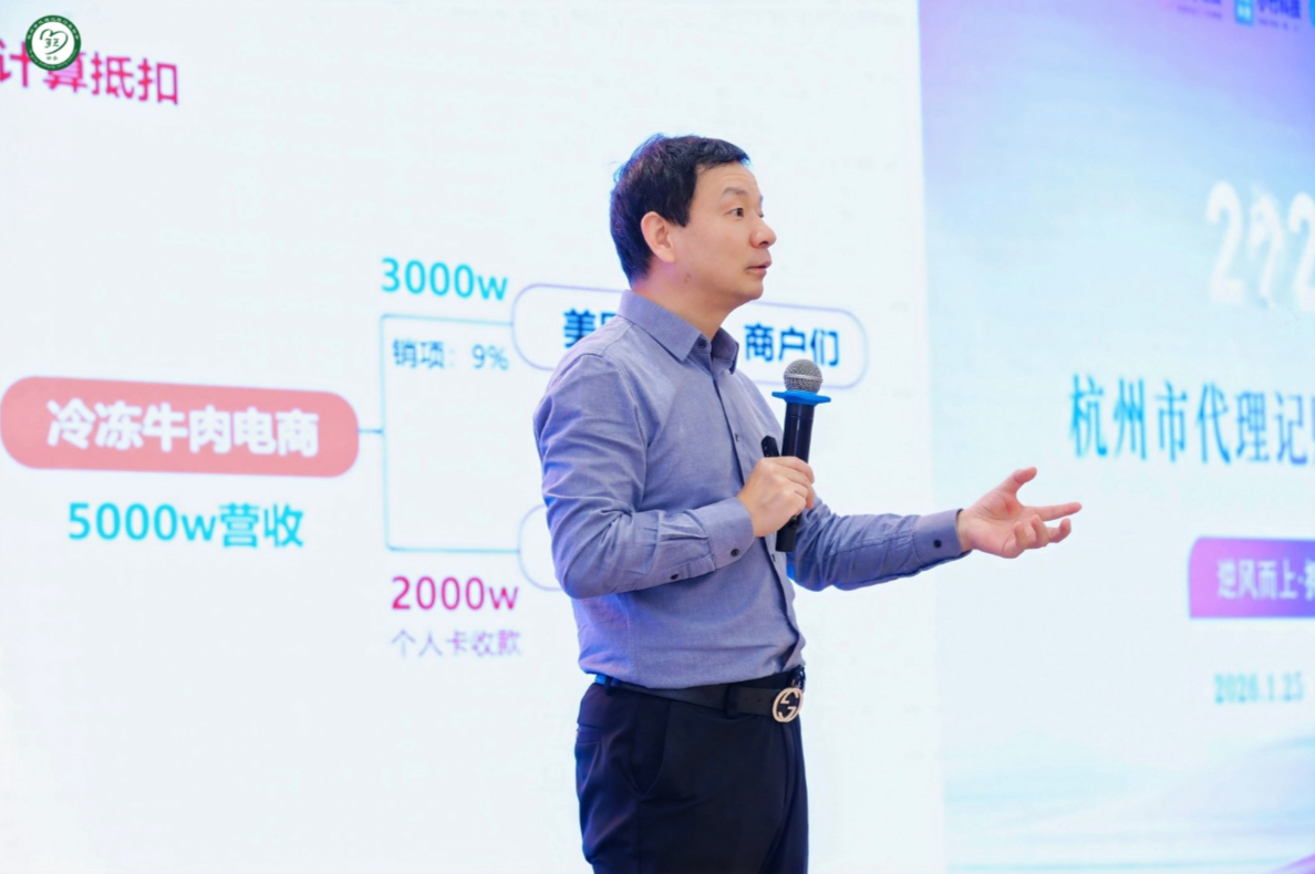 2026年1月25日,何明涛出席杭州市代理记账行业协会年会,发表《电商财税合规业务拓展实践方法论》主题演讲,并介绍了杭州园区。他结合电商新趋势急实战案例,为与会代账公司解析了市场机遇与转型路径,现场反响热烈,与会者纷纷表示收获颇丰。